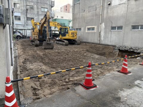 建物本体の解体完了後、基礎部分の撤去に移ります。RC造の基礎は非常に強固なため、大型ブレーカーや油圧圧砕機などの専門機械を使用して慎重に破砕しました。地中深くまで埋設された基礎を完全に撤去することで、次の開発工程へ円滑に移行できる状態を実現します。